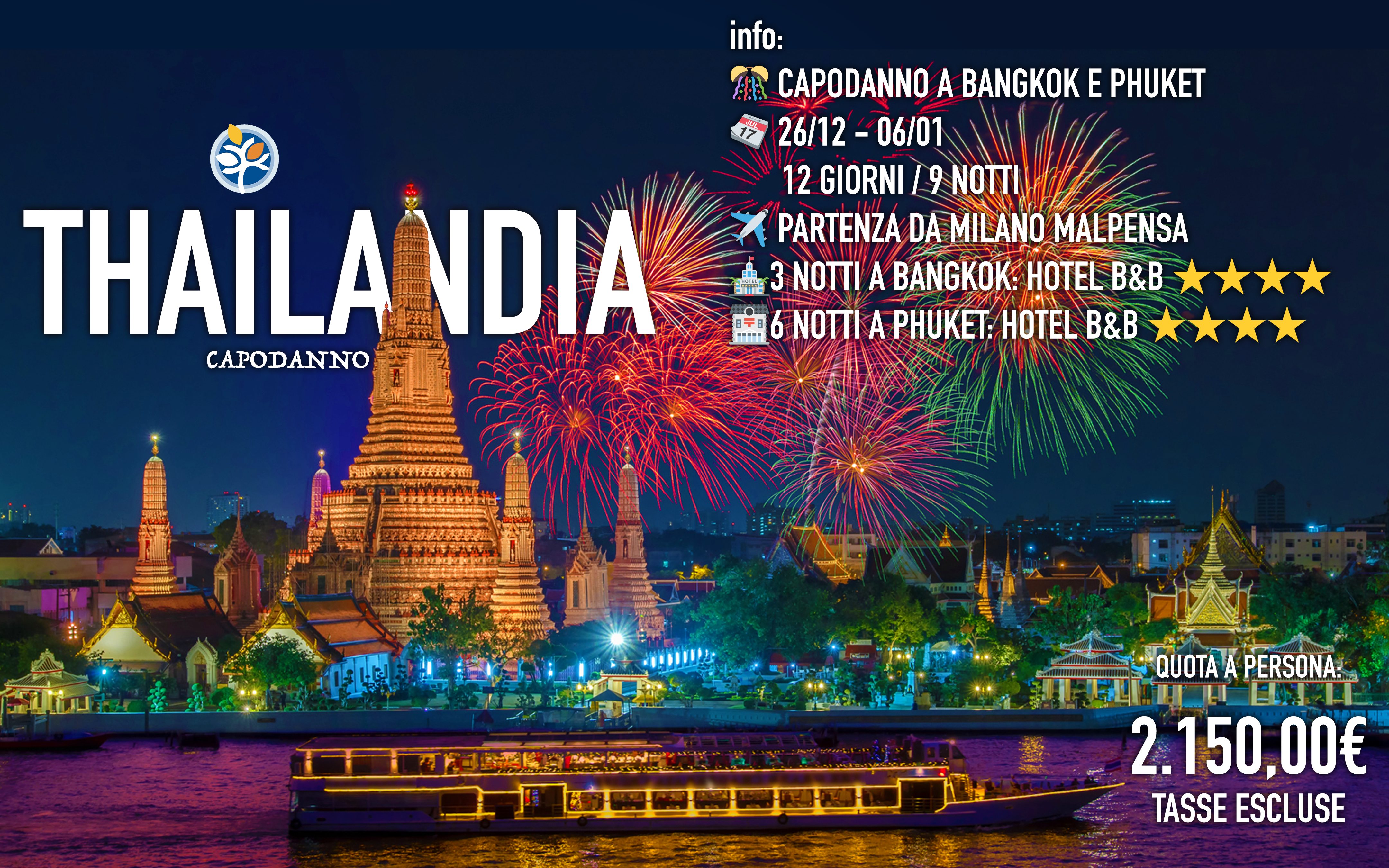 info: 🎊 CAPODANNO A BANGKOK E PHUKET 📆 26/12 - 06/01 12 GIORNI / 9 NOTTI ✈️ PARTENZA DA MILANO MALPENSA 🏨3 NOTTI A BANGKOK: HOTEL B&B ⭐️⭐️⭐️⭐️ 🏣6 NOTTI A PHUKET: HOTEL B&B ⭐️⭐️⭐️⭐ Info e prenotazioni: 📞 331 617 7487 📫 info@ilmandorloviaggi.it 📍 Via cervese 1005, 47521, Cesena
