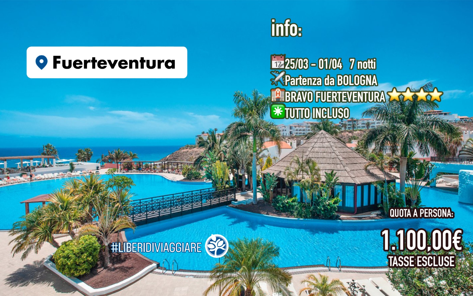 Partite da Bologna e atterrate in questa destinazione da sogno. Il vostro alloggio sarà presso il lussuoso Bravo Fuerteventura, un hotel a 4 stelle, pronto a garantirvi un soggiorno piacevole e confortevole. 🏨🌟